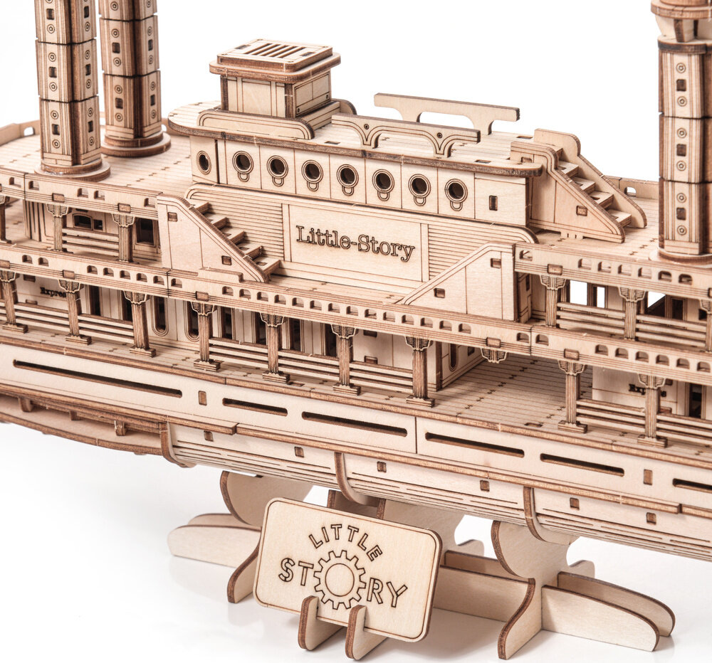 Lesena 3D sestavljanka - Parnik Little Story E025 je eleganten model zgodovinskega parnika, zasnovan za ljubitelje tehnologije, ladij in natančno izdelanih lesenih gradbenih kompletov. Ta model prihaja iz delavnice Little Story in je izdelan na Poljskem z največjo pozornostjo do detajlov, od značilnega kolesa do realistično oblikovanih palub.